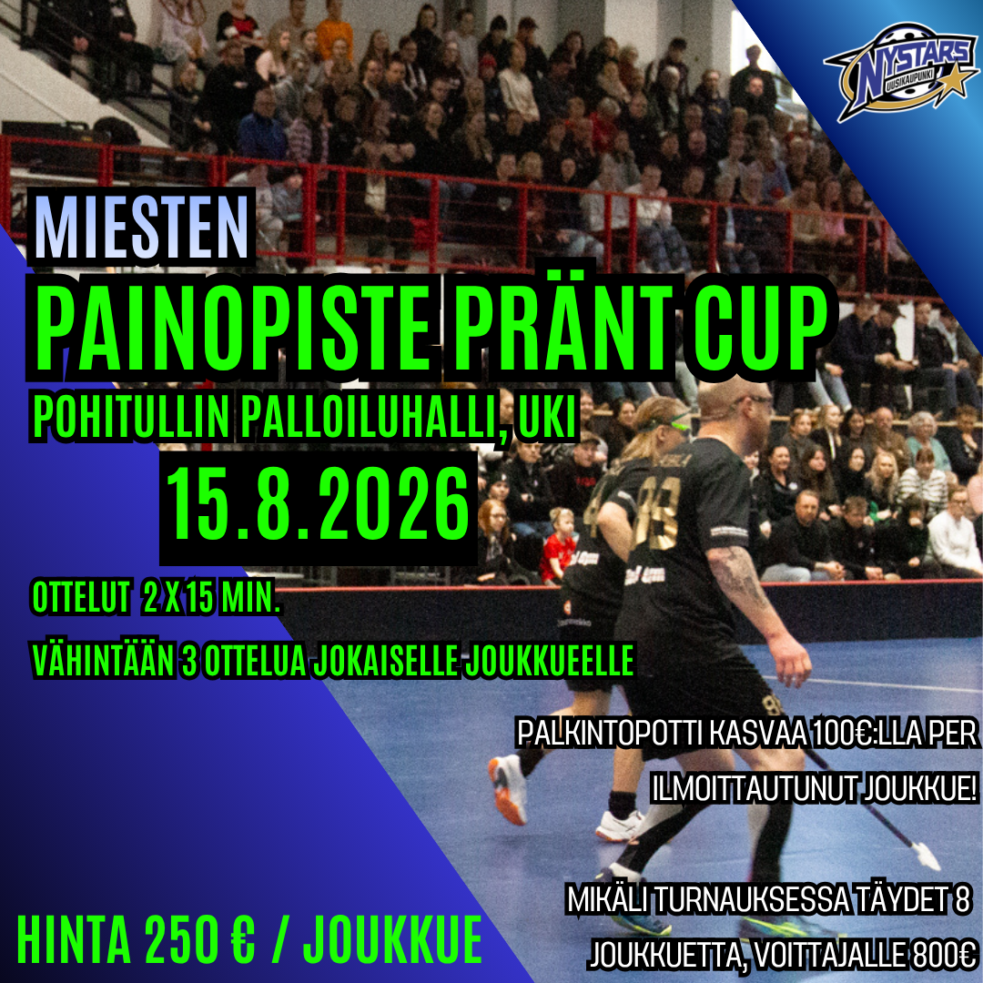 Perinteinen kauden avausturnaus Painopiste Pränt Cup pelataan tänä vuonna Lauantaina 15.8. Turnaukseen otetaan mukaan kahdeksan sarjajoukkuetta ilmoittautumisjärjestyksessä. Turnauksen hinta on 250€/joukkue. Turnauksessa on palkintopotti, joka kasvaa aina 100€:lla kun joukkue ilmoittautuu, eli turnauksen täyttyessä potissa on 800€ voittajalle.